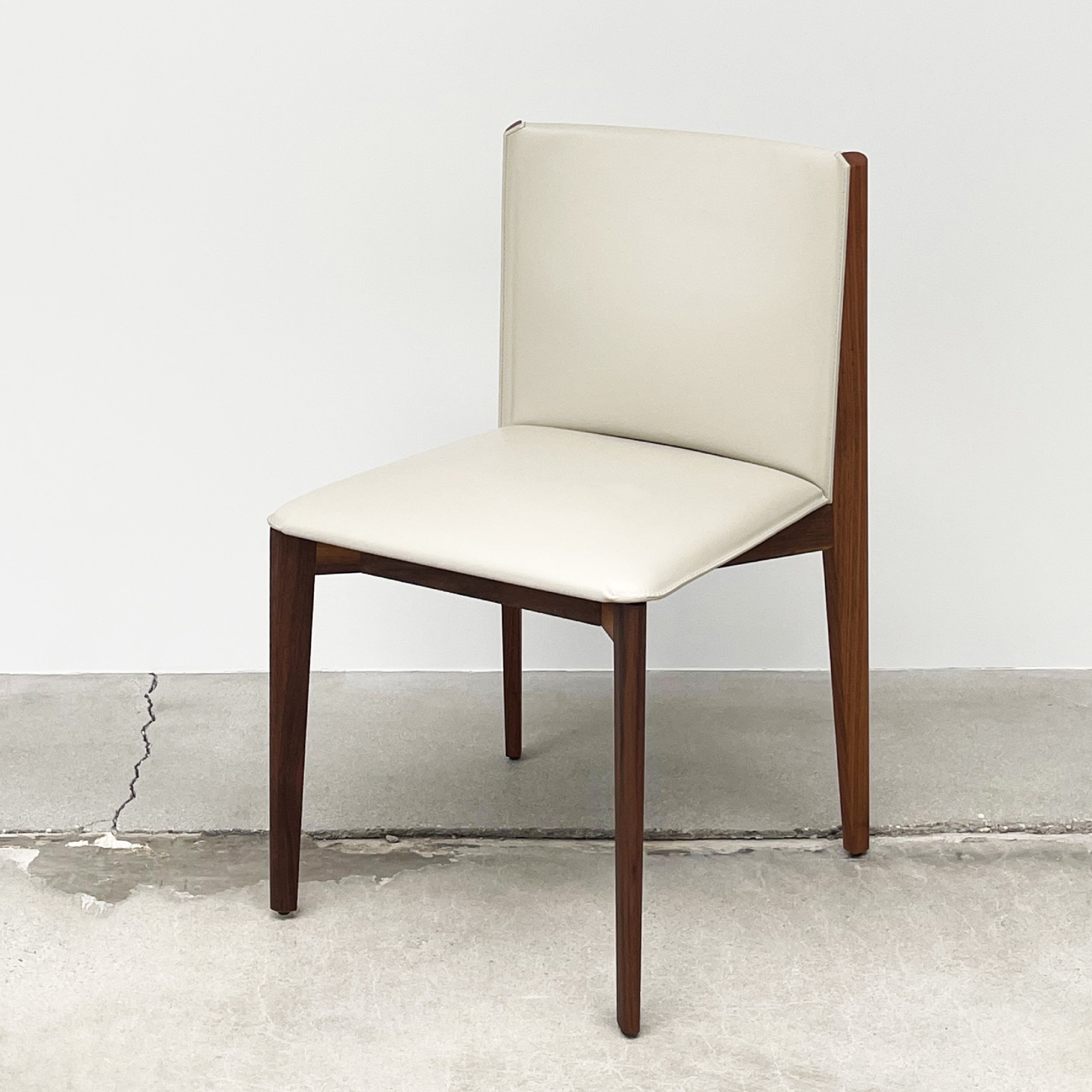 Set of eight dining chairs with cream saddle leather seats and solid walnut canaletto wooden structures.